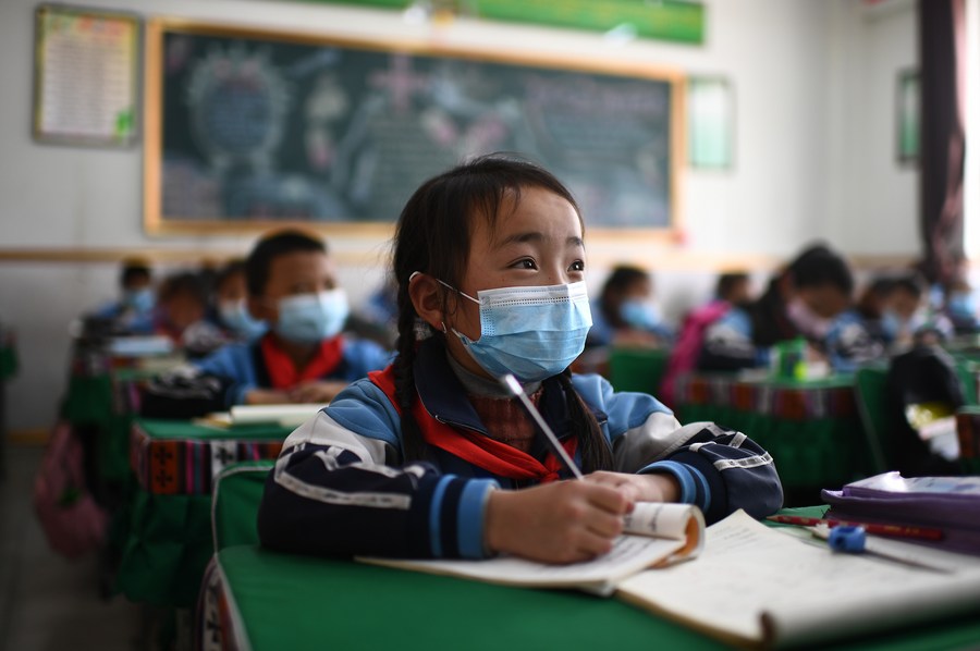 A student takes a class at a primary school in Yushu City, Yushu Tibetan Autonomous Prefecture, northwest China's Qinghai Province, April 9, 2020. (Xinhua/Zhang Hongxiang)