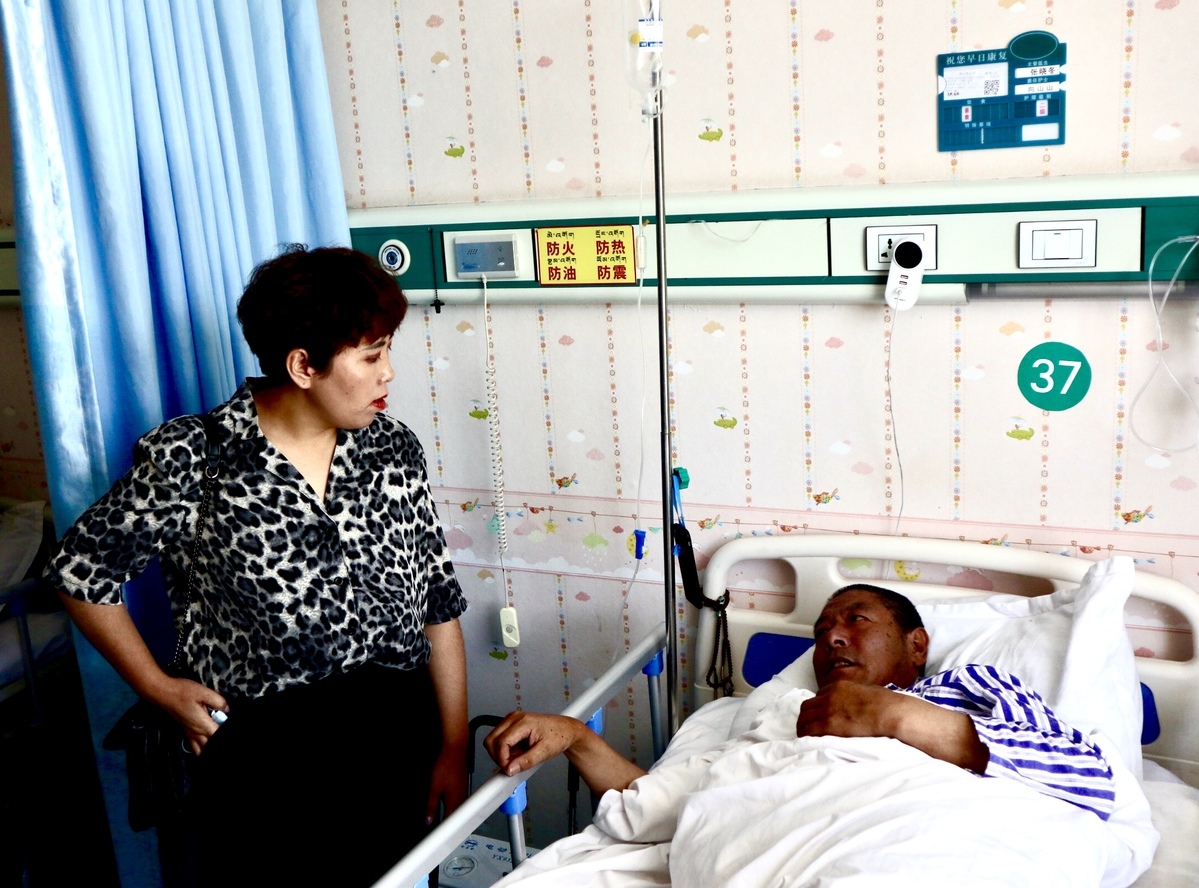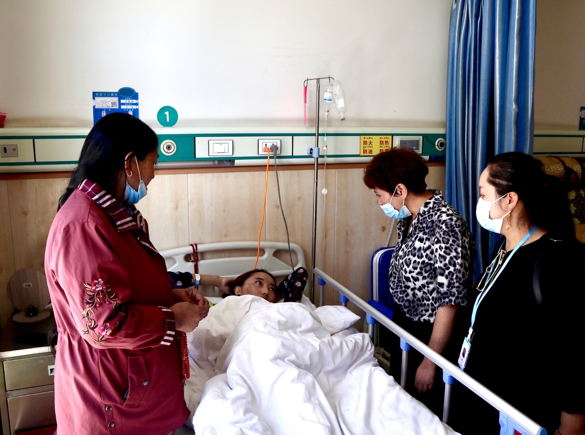 Kyila, a visually impaired woman working for the Fukang Angel Foundation, checks the condition of a patient in the hospital. [Photo by Palden Nyima/chinadaily.com.cn]