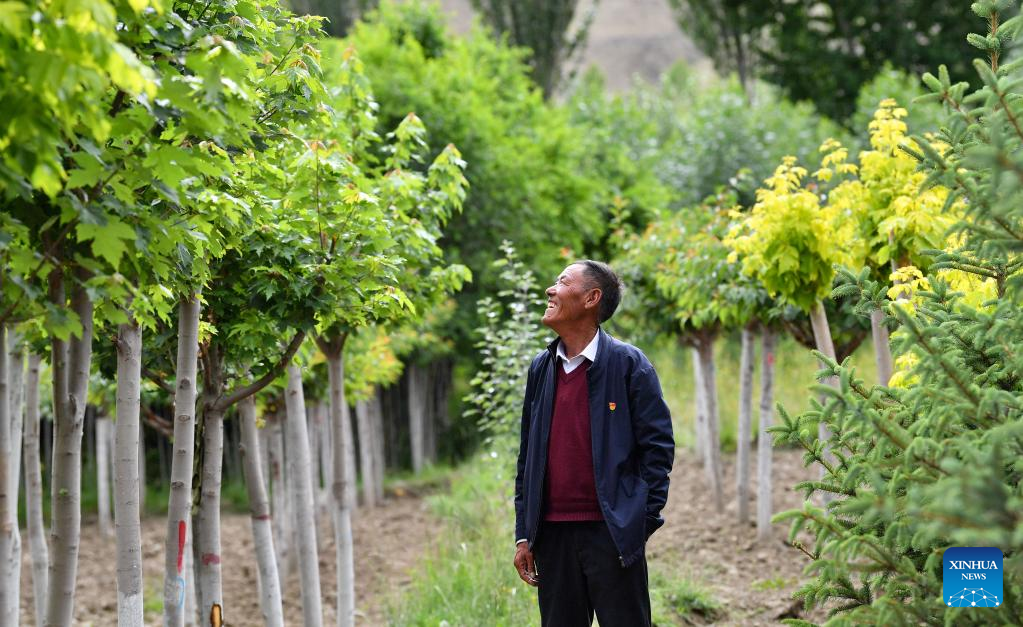 File photo taken on July 20, 2021 shows Penjig checking saplings at his nursery in Zhanang County, Shannan City of southwest China's Tibet Autonomous Region.