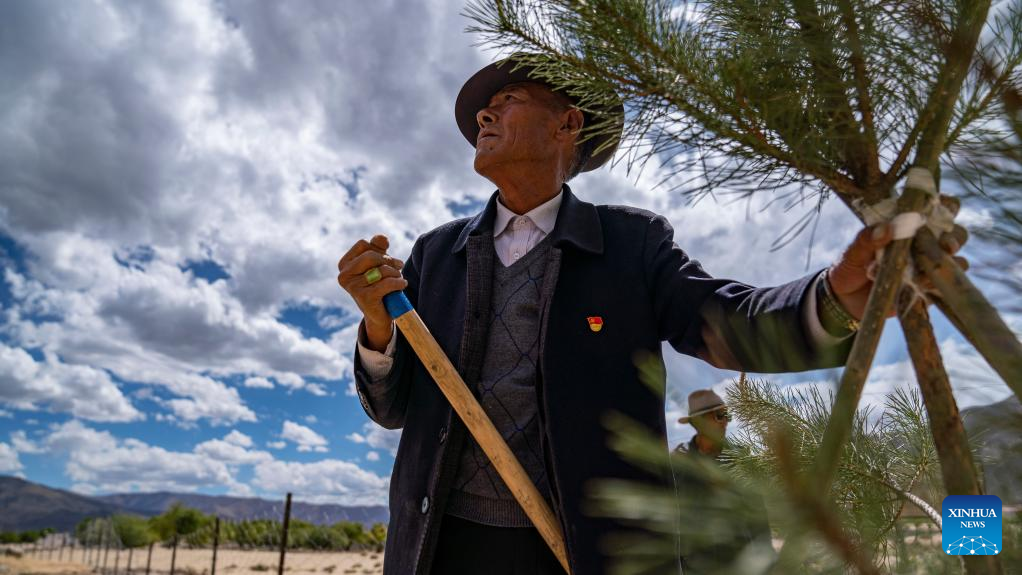 Penjig checks the growth of saplings at the afforestation area by the Yarlung Zangbo River in Zhanang County, Shannan City of southwest China's Tibet Autonomous Region, May 26, 2022.