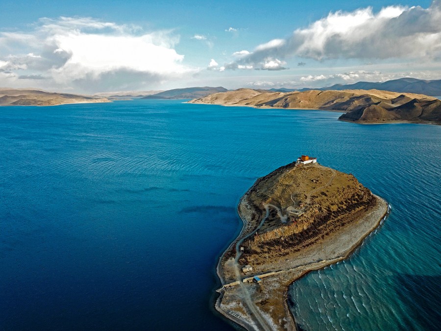 Aerial photo taken on April 16, 2022 shows the scenery of the Yamzbog Yumco Lake in Shannan, southwest China's Tibet Autonomous Region. Known as "the roof of the world," southwest China's Tibet Autonomous Region is deemed the "water tower" of Asia, a climate regulator and gene pool of the planet Earth. (Xinhua/Jiang Fan)