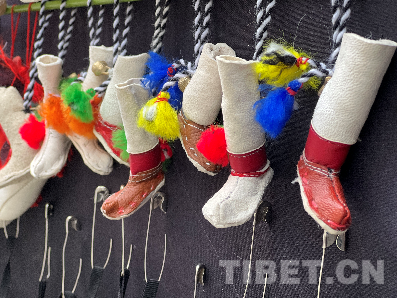 On both sides of the gate, there hang rows of unique and finely produced mini Tibetan boots, sheepskin bag for kneading tsampa(roasted highland qingke barley flour)and "Uduo" for driving cattle and sheep and so on, attracting particular attention.