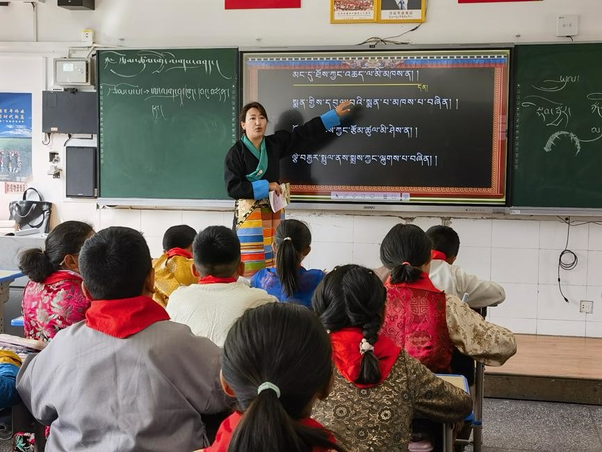 Students at Nyingchi Second Primary School in Nyingchi, Tibet autonomous region, study the Tibetan language. [Photo by Palden Nyima/China Daily]