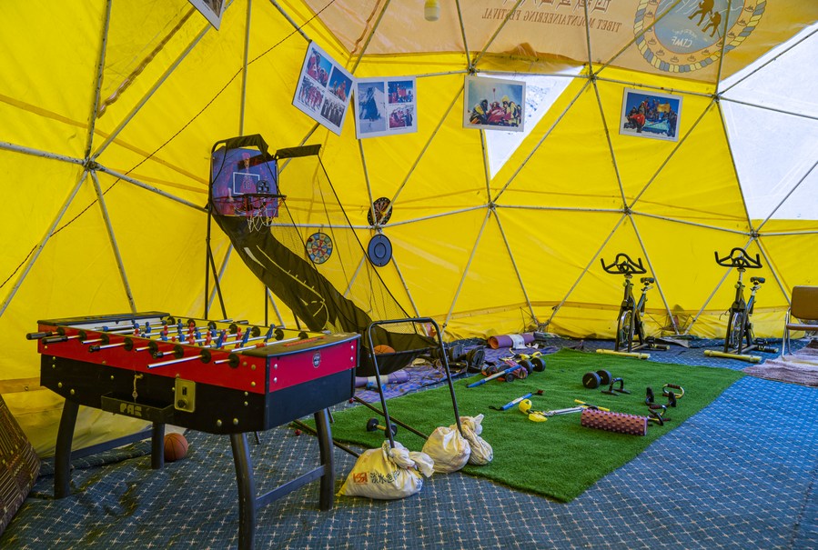 This photo taken on May 22, 2023 shows a gym inside a tent at the mountaineering base camp in the Qomolangma National Nature Reserve in southwest China's Tibet Autonomous Region. (Xinhua/Sun Fei)