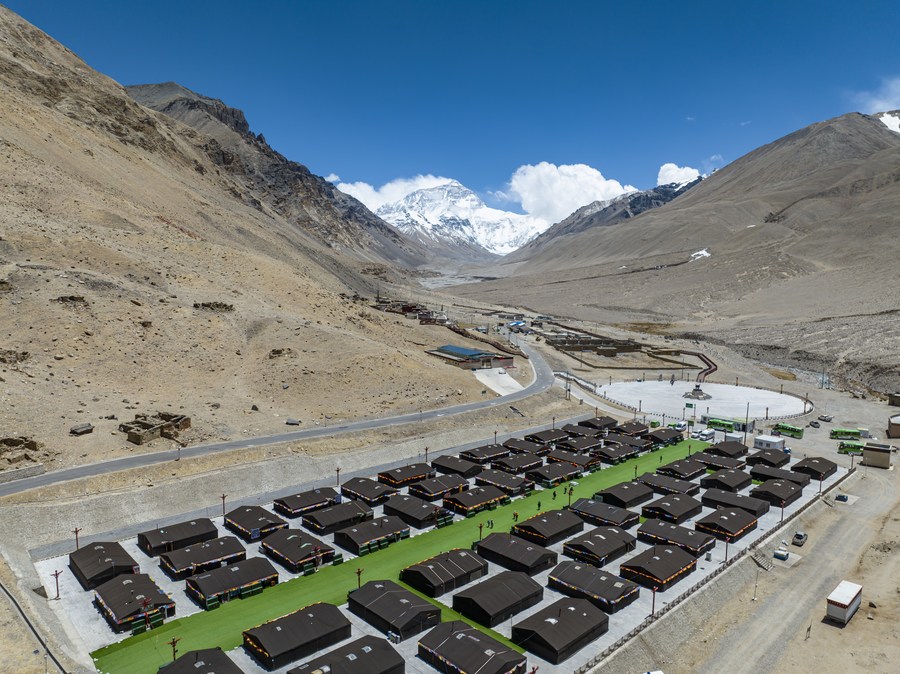 This aerial photo taken on May 20, 2023 shows the tourist base camp in the Qomolangma National Nature Reserve in southwest China's Tibet Autonomous Region. (Xinhua/Sun Fei)