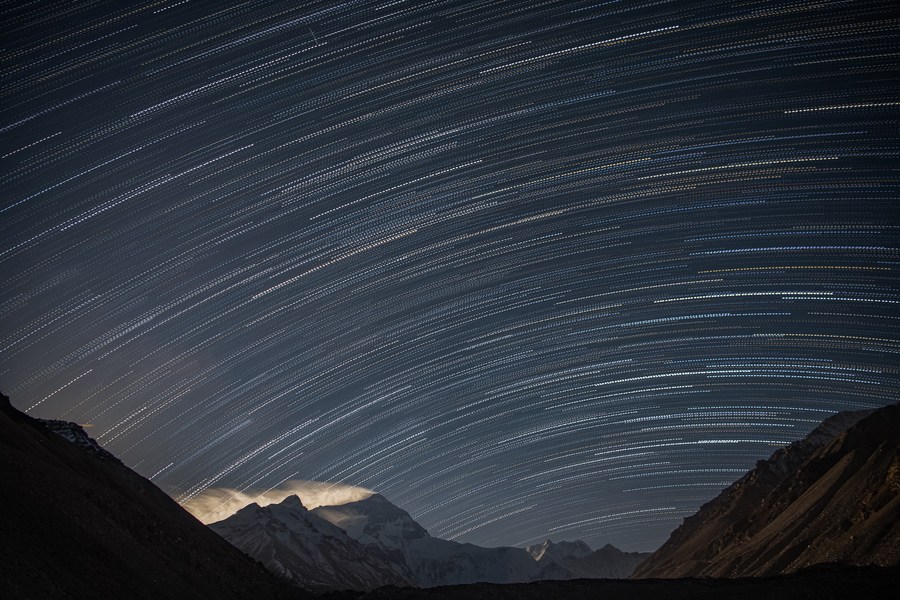 This composite photo taken on May 10, 2023 shows star trails above Mount Qomolangma in southwest China's Tibet Autonomous Region. (Xinhua/Sun Fei)