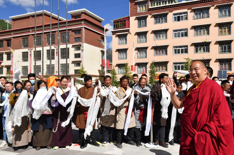 Panchen Erdeni Chos-kyi rGyal-po waves to locals in Gamtog Township of Jomda County, southwest China's Tibet Autonomous Region, June 5, 2023.(Photo by Chogo/Xinhua)