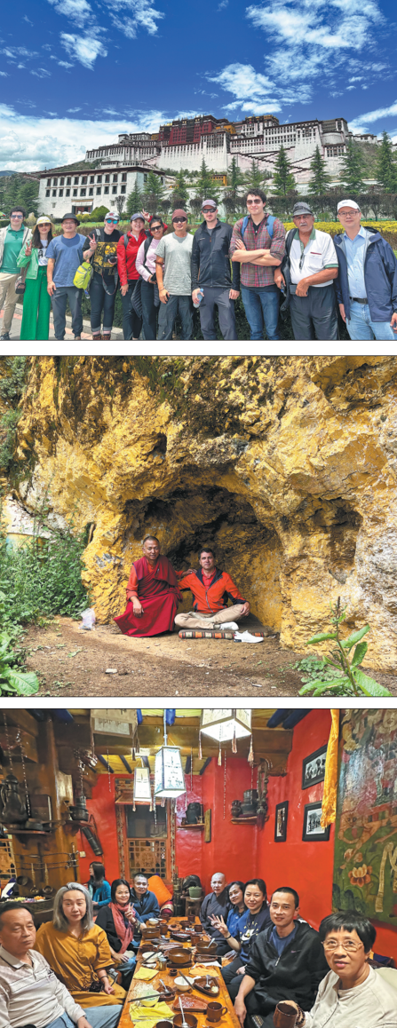 From top: Foreign tourists pose for a photo before visiting the famed Potala Palace in Lhasa, the capital city of the Tibet autonomous region. Russian tourist Vladimir Poda practices meditation along with a Buddhist monk at the Drakyerpa Monastery near Lhasa. Some overseas and domestic tourists have a meal in a Tibetan restaurant in Lhasa in May. CHINA DAILY