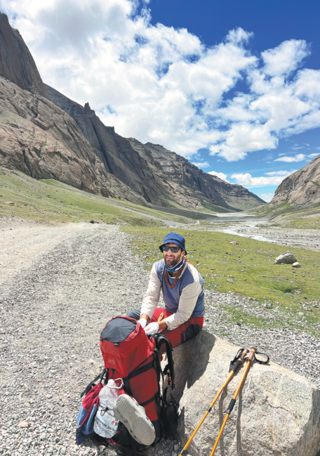 An overseas tourist sorts through his backpack before approaching Mount Kailash. CHINA DAILY