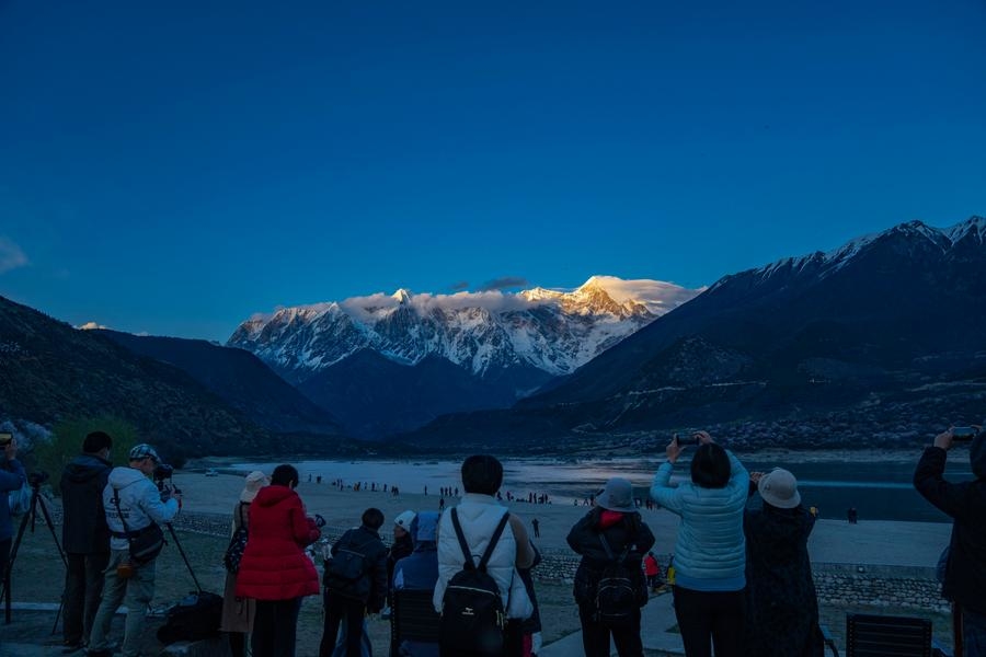 Tourists take photos of Mount Namjagbarwa in Suosong Village in Nyingchi, southwest China's Xizang Autonomous Region, April 1, 2024. (Xinhua/Sun Fei)