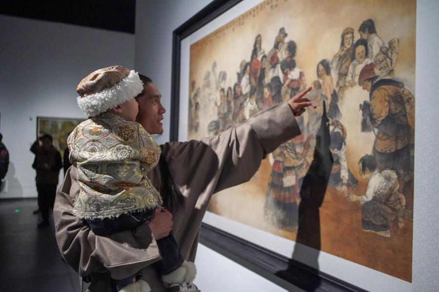 Visitors view exhibits in the Xizang Art Museum in Lhasa, capital of southwest China's Xizang Autonomous Region, Nov. 15, 2023. (Xinhua/Shao Zedong)