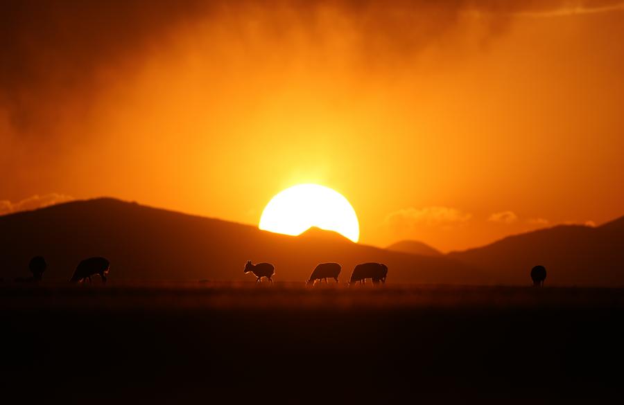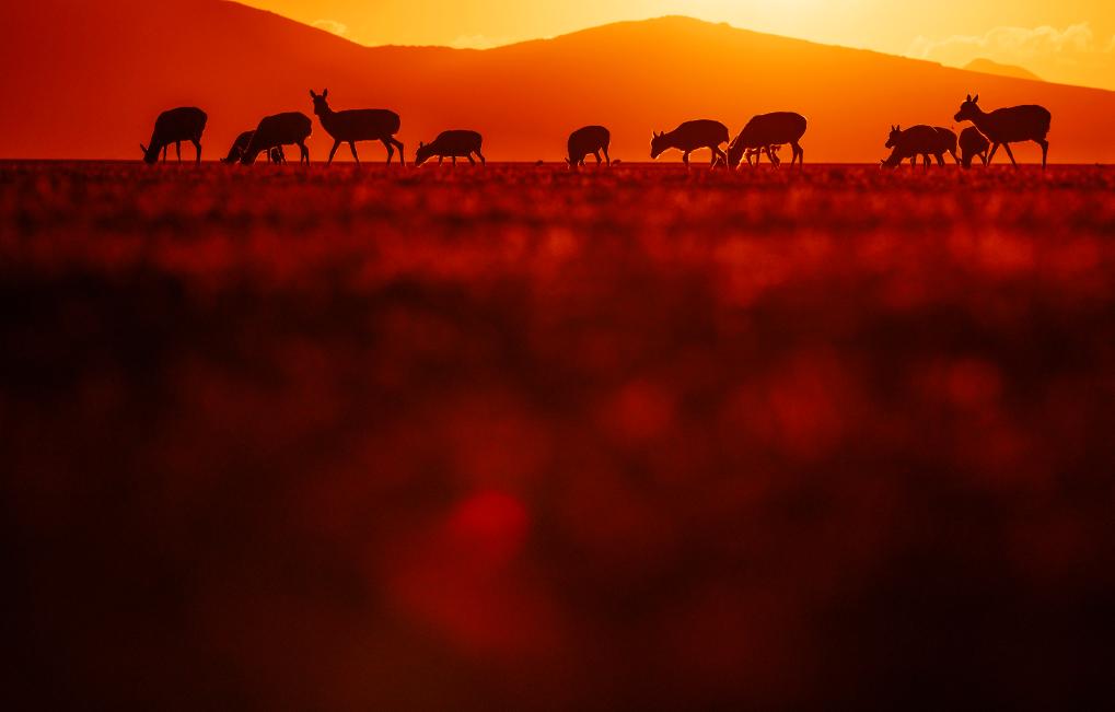 Tibetan antelopes are pictured at sunset in Qiangtang National Nature Reserve in southwest China's Xizang Autonomous Region, June 16, 2024. (Xinhua/Jigme Dorje)