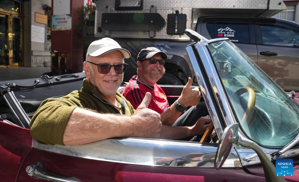 LHASA, June 27 (Xinhua) -- This summer, a classic red Jaguar convertible and two British adventurers in it, captured the hearts of social media users as they found themselves broken down on National Highway 318 in southwest China's Xizang Autonomous Region.