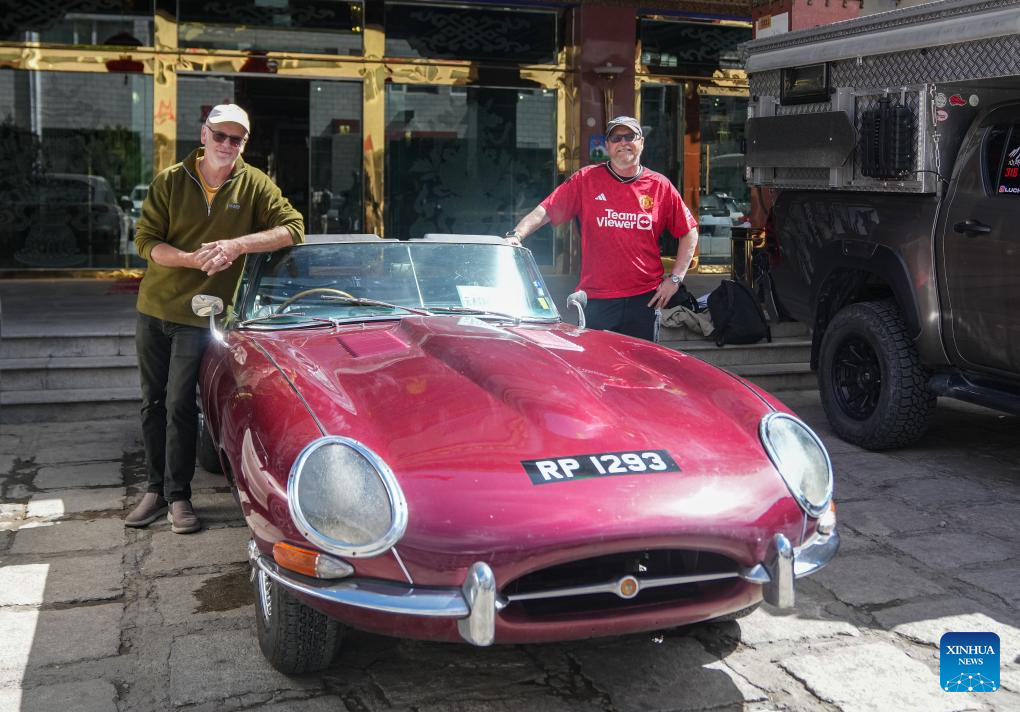 Michael Henry Johnston (L) and Paul John Rowlands pose for a photo with their car in Lhasa, southwest China's Xizang Autonomous Region, May 17, 2024. (Xinhua/Jigme Dorje)