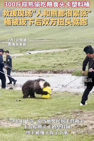 A recent video of a brown bear in Northwest China's Qinghai Province with its head stuck in a plastic bucket after trying to steal food from local herders attracted lots of attention, as both the bear and its rescuers quickly ran in opposite directions following a "tug-of-war" rescue.
