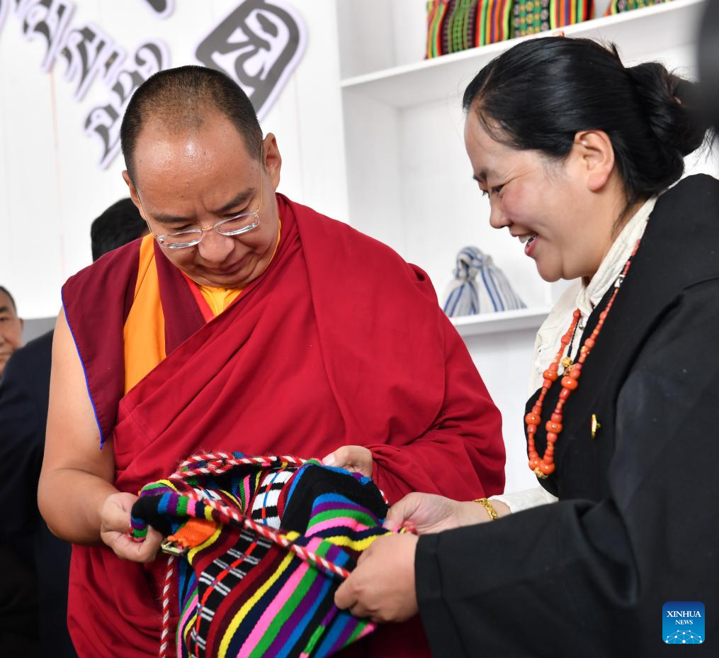 Panchen Erdeni Chos-kyi rGyal-po visits an exhibition themed on rural revitalization in Nagqu City, southwest China's Xizang Autonomous Region, Aug. 8, 2024. Panchen Rinpoche concluded his tour of Nagqu City in Xizang Autonomous Region, and returned to the region's capital of Lhasa on Aug. 11. (Photo by Chogo/Xinhua)