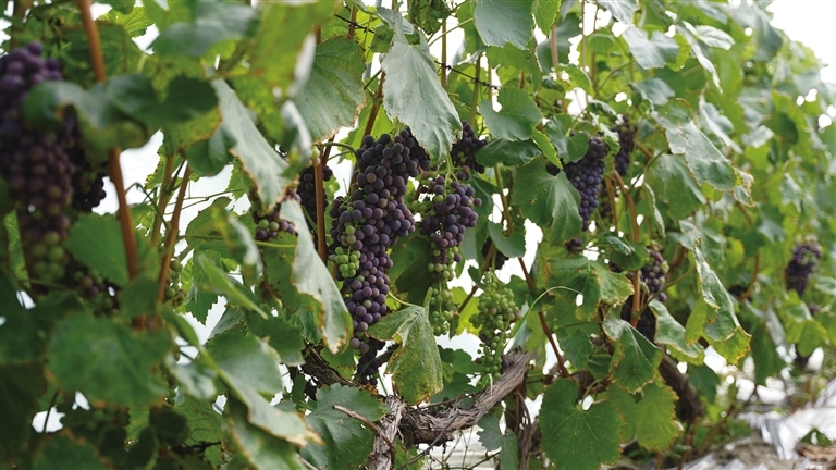 In a vineyard in Sangri County, rows of neat grape trellises are filled with green and purple grapes. It is a critical period of fruit setting of grapes at this time. Technicians and workers of the Working Team Asisting Xizang of Hunan Province are busy under the greenhouse, happy for the upcoming harvest.