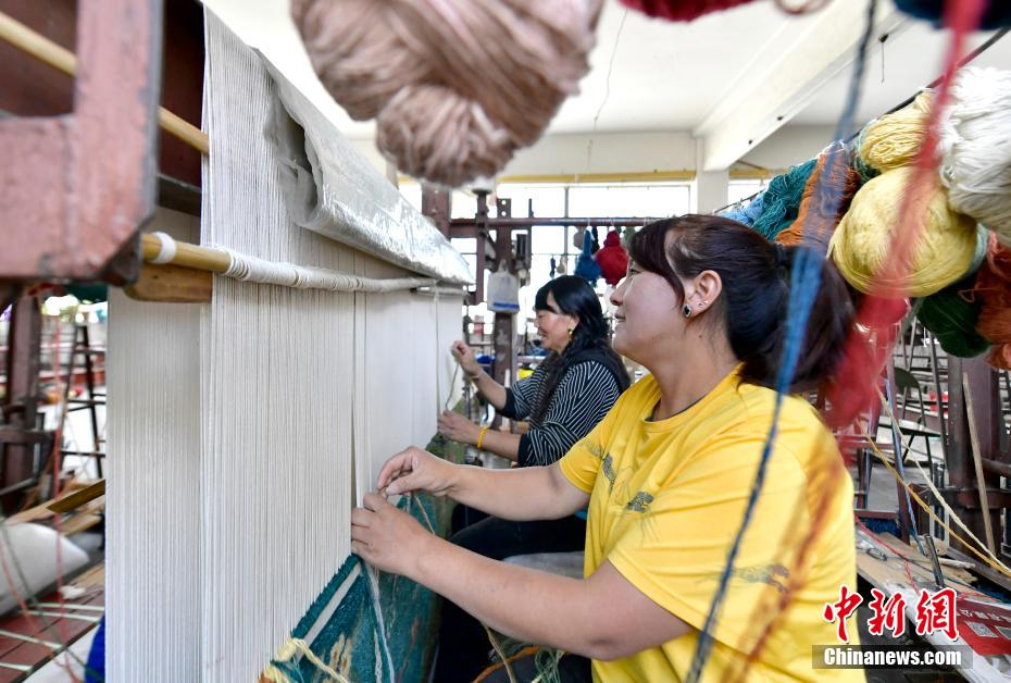 In a Tibetan carpet plant in Lhasa, Xizang, craftsmen are weaving Tibetan carpets with exquisite patterns with the traditional Tibetan hand-knotting method.