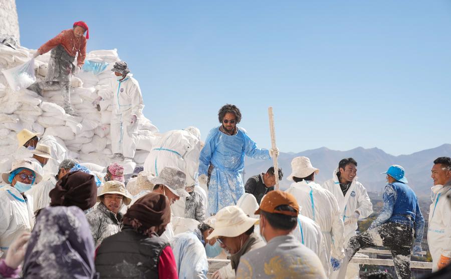 Workers paint the wall of the Potala Palace during an annual renovation of the ancient architectural complex in Lhasa, southwest China's Xizang Autonomous Region, Oct. 30, 2024. (Xinhua/Jigme Dorje)