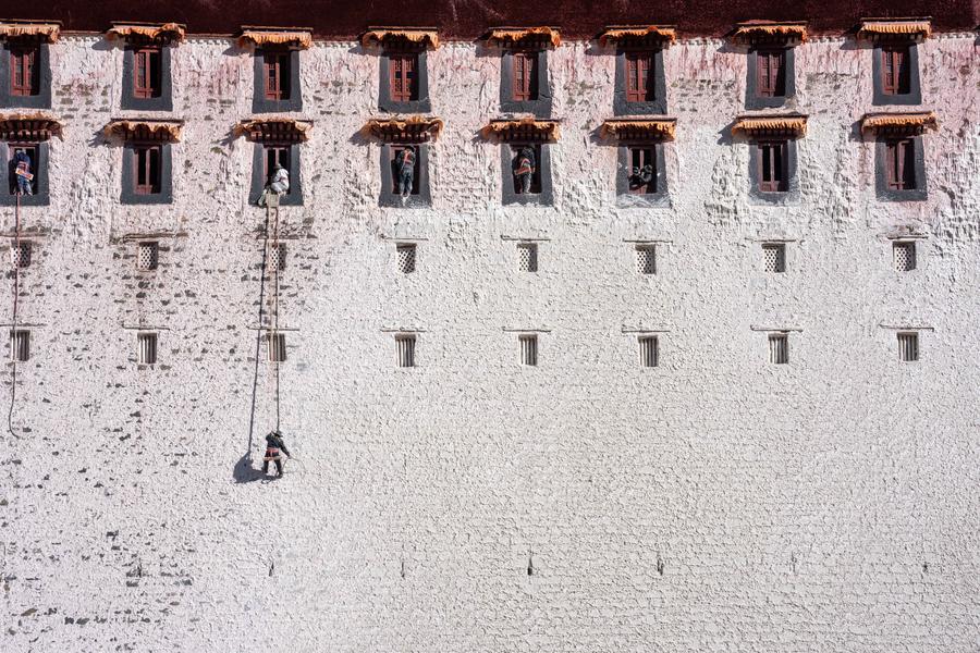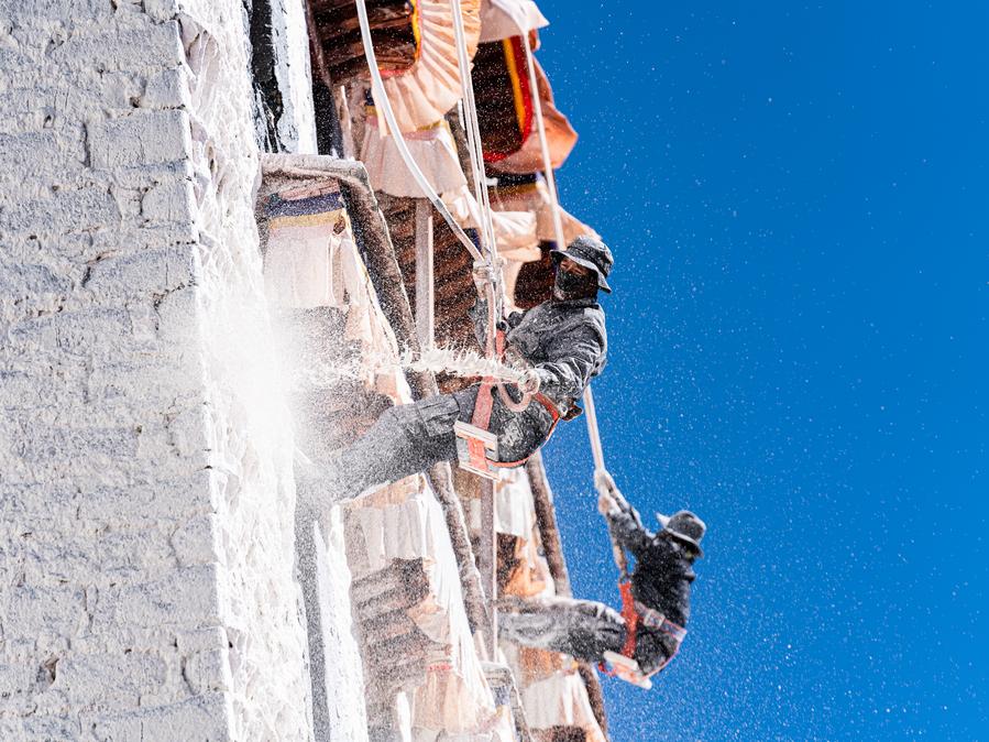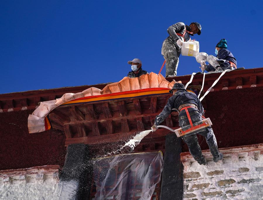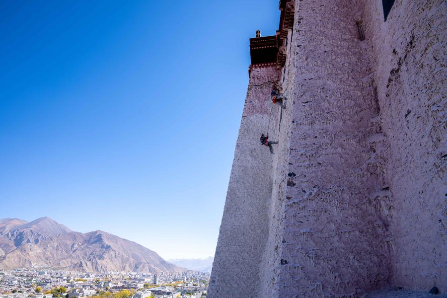 Workers paint the wall of the Potala Palace during an annual renovation of the ancient architectural complex in Lhasa, southwest China's Xizang Autonomous Region, Oct. 30, 2024. (Xinhua/Tenzin Nyida)