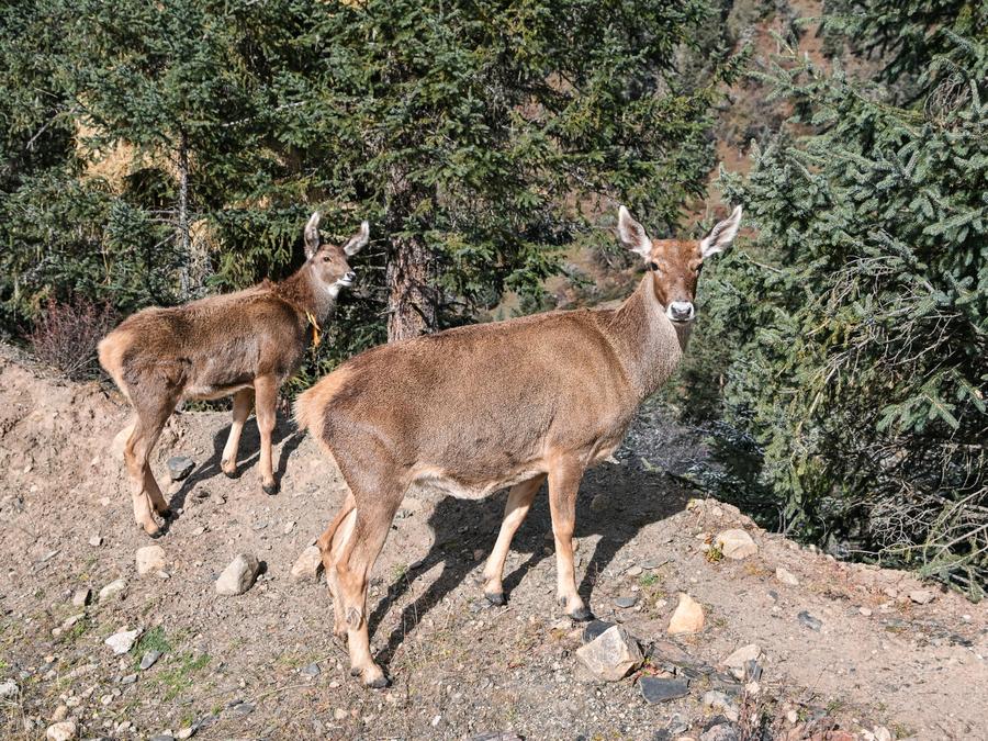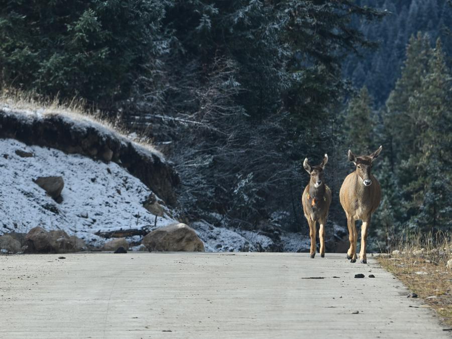 Two white-lipped deer are pictured in Duopugou scenic spot in Dege County of Garze Tibetan Autonomous Prefecture, southwest China's Sichuan Province, Nov. 4, 2024. (Xinhua/Wang Xi)