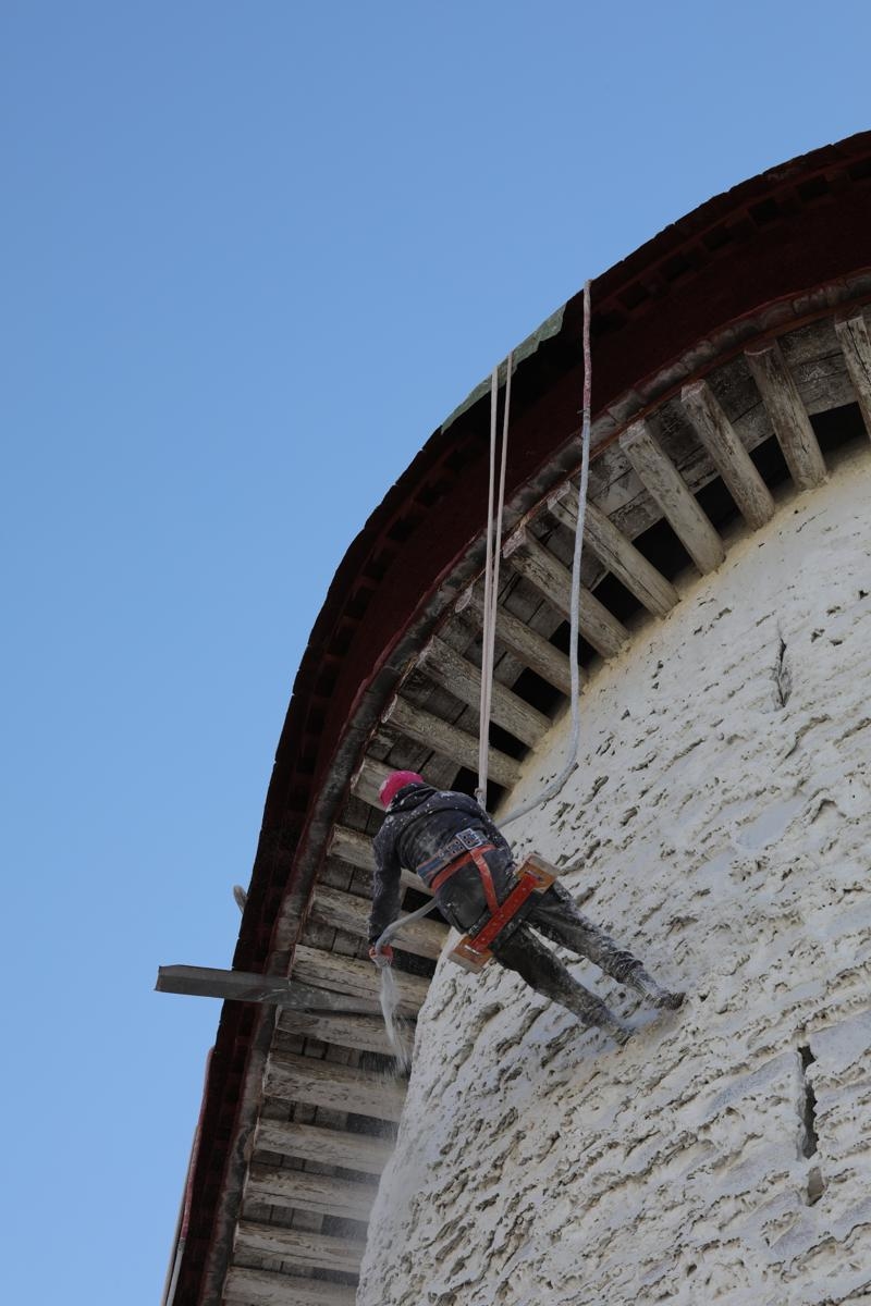 Around the ninth month of the Tibetan calendar, after the rainy season in Xizang, the Potala Palace undergoes a "beautification" painting.