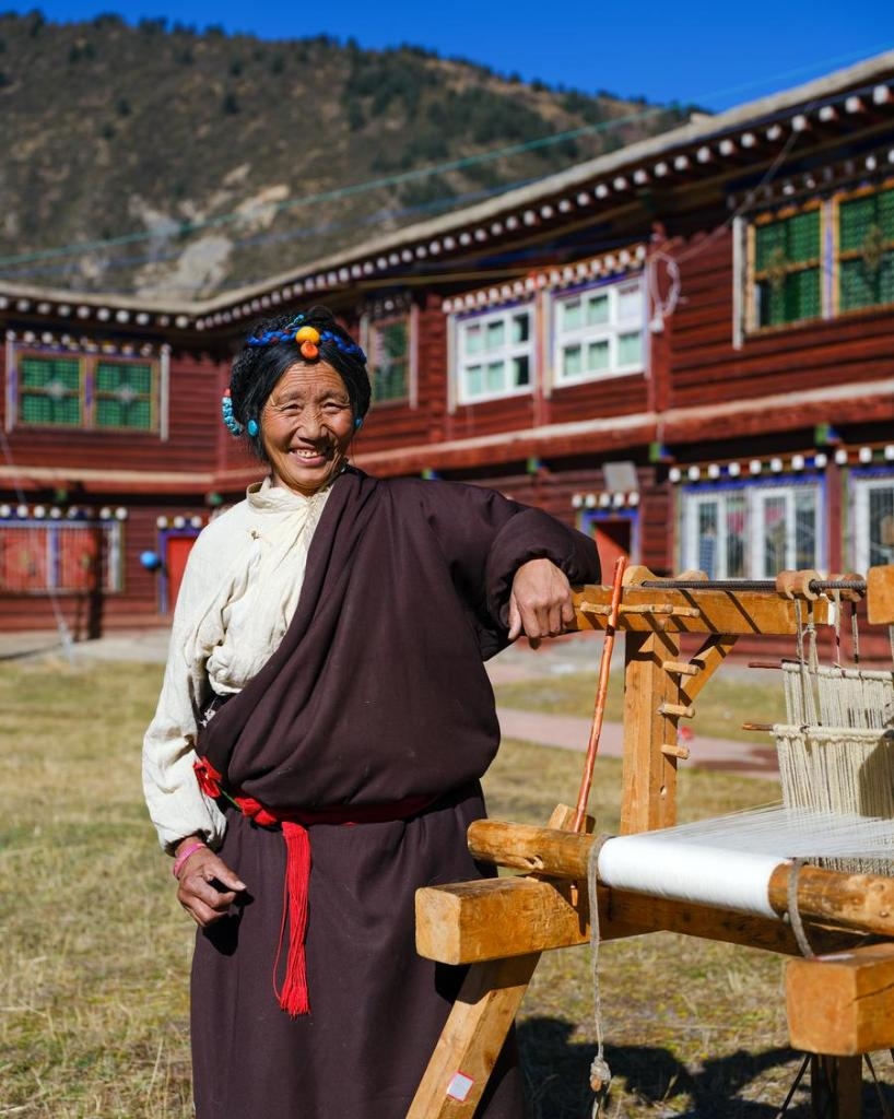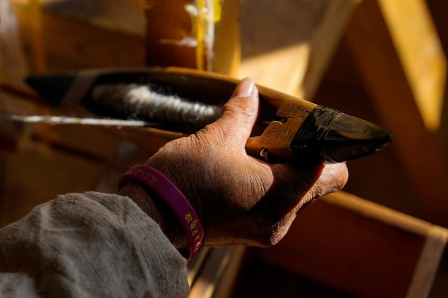 Women in the Nayo family have excellent weaving skills. They can weave high-quality textiles using wool from yak and sheep. Doltru, born in Maisu Town of Dege County in 1960, is the inheritor and promoter of the Nayo family's weaving craft. With the help of her daughter Tashi Chogtso, the products of Nayo's workshop grow in abundance and popularity. (Xinhua/Shen Bohan)