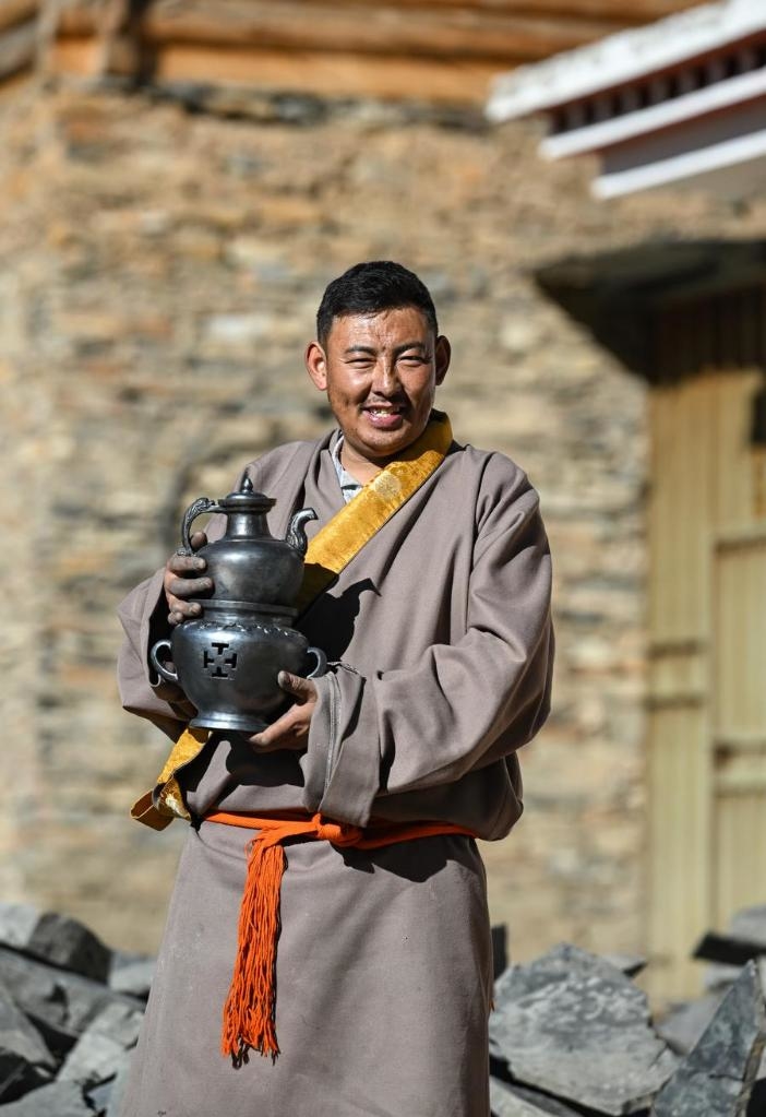 Dawa Dakpa was born into a family of craftsmen who have been carrying on the Lima Bronze casting technique for about 200 years in Maisu Town of Dege County. Dawa Dakpa learned from his father Nyima when he was young, becoming the seventh generation inheritor of the Lima Bronze casting technique. He is also the representative inheritor of "Tibetan metal forging skills" in Garze Prefecture, Sichuan Province. (Xinhua/Shen Bohan)