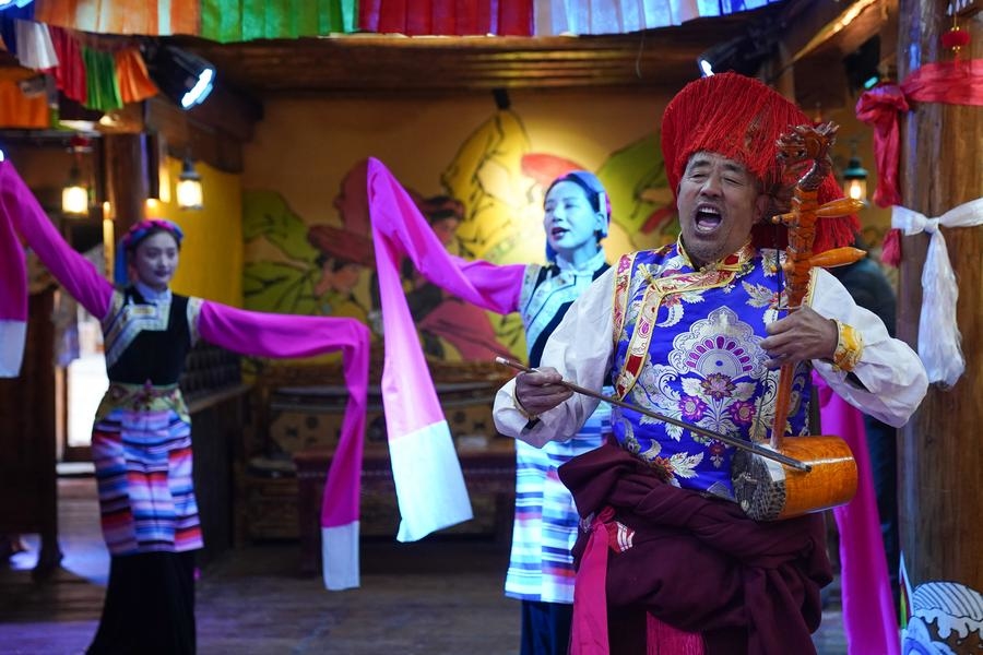 Tashi Wang (1st R) performs during Batang Xianzi dance in Batang County of Garze Tibetan Autonomous Prefecture, southwest China's Sichuan Province, Nov. 5, 2024.Xianzi dance is a popular art form in Batang County. The 66-year-old Tashi Wang, a master of Xianhu string instrument, is the provincial inheritor of Batang Xianzi dance. In order to protect and inherit Xianzi dance and Xianhu making skills, Tashi Wang built a Xianhu making workshop in his house, and performed in various activities to demonstrate the rhythm of Xianhu and the charm of Xianzi dance. (Xinhua/Xu Bingjie)