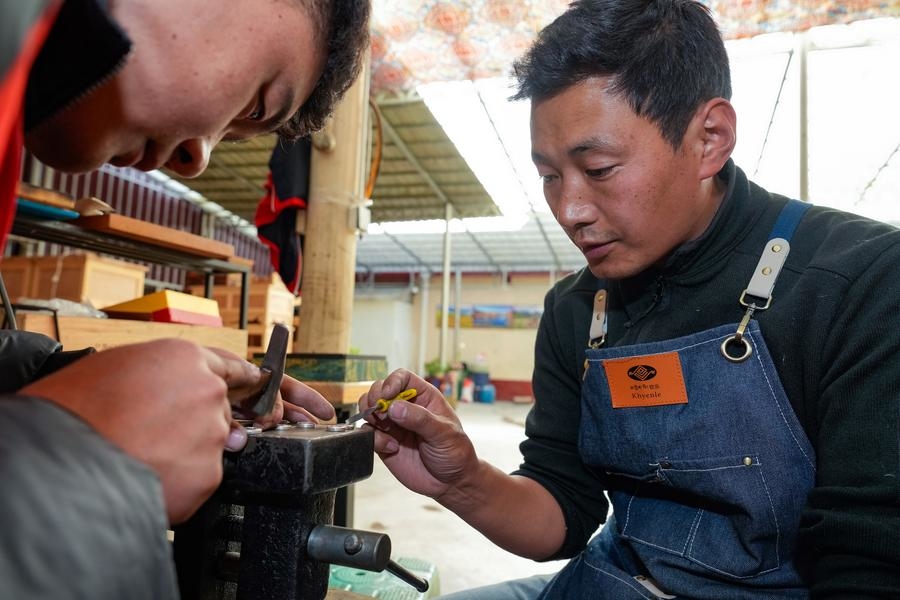 Dawa Dakpa (R) gives instruction to an apprentice during a training session in Dege County of Garze Tibetan Autonomous Prefecture, southwest China's Sichuan Province, Nov. 3, 2024. Dawa Dakpa was born into a family of craftsmen who have been carrying on the Lima Bronze casting technique for about 200 years in Maisu Town of Dege County. Dawa Dakpa learned from his father Nyima when he was young, becoming the seventh generation inheritor of the Lima Bronze casting technique. He is also the representative inheritor of "Tibetan metal forging skills" in Garze Prefecture, Sichuan Province. (Xinhua/Shen Bohan)