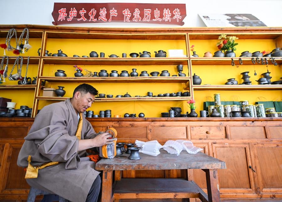 Kunga Lobdue packages black pottery products for delivery in Maisu Town of Dege County of Garze Tibetan Autonomous Prefecture, southwest China's Sichuan Province, Nov. 3, 2024. Kunga Lobdue, 39, is the inheritor of Sichuan provincial intangible cultural heritage "Maisu black pottery" and the founder of Maisu black pottery workshop. He has been busy making black pottery products for a catering company recently. (Xinhua/Wang Xi)