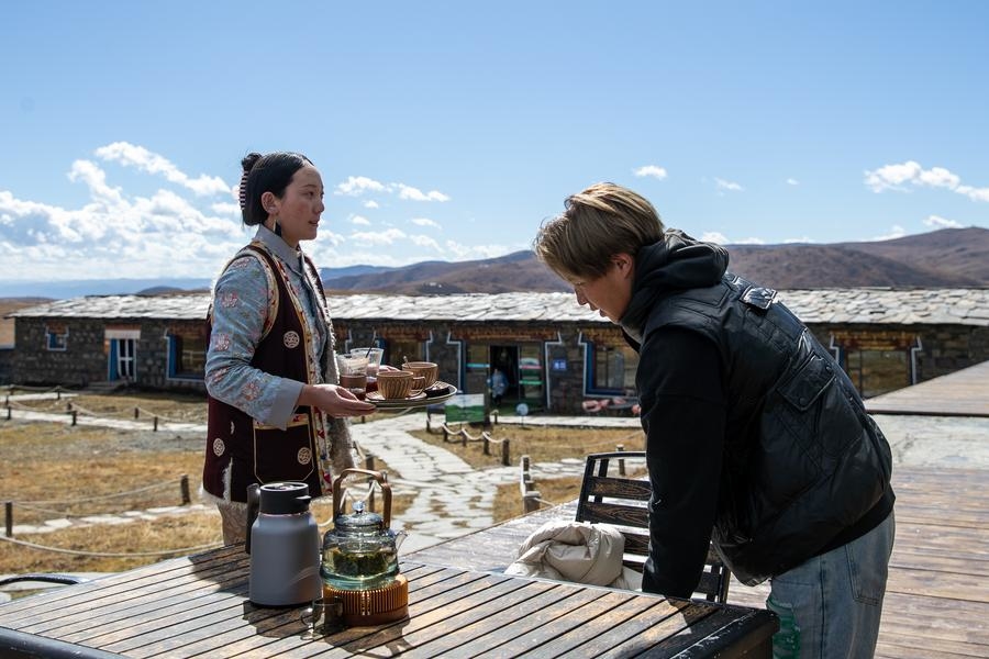 Dake (R) and his wife work in a cafe in Balang Sumdho Village of Kangding City in Garze Tibetan Autonomous Prefecture, southwest China's Sichuan Province, Oct. 28, 2024. Born in 1997, Dake grew up in Balang Sumdho Village, where people have relied on herding for generations. In recent years, the village has begun to develop the tourism industry, and young people started returning to the village one after another, including Dake. Through continuous learning in making coffee, Dake created buttered latte featuring local characteristics. Together with his wife, Dake works as a barista in a cafe on the observation platform of Balang Sumdho Village. (Xinhua/Chu Jiayin)