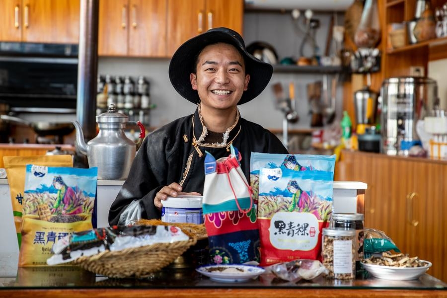 Dawa displays products for live-streaming sales in Jiawa Town of Litang County in Garze Tibetan Autonomous Prefecture, southwest China's Sichuan Province, Nov. 3, 2024. Born in 1999, Dawa grew up in Jiawa Town, Litang County. After graduating from college, Dawa returned to his hometown from Chengdu and became a tour guide. He usually records his daily life on the phone and posts it on social media. At the end of 2023, Dawa and his family started e-commerce live-streaming business to promote local products. (Xinhua/Chu Jiayin)