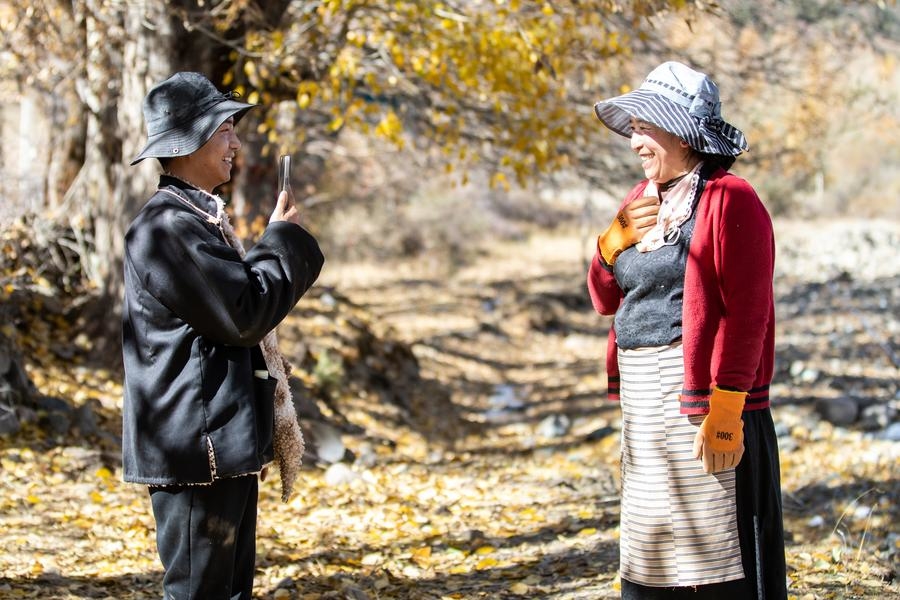 Dawa (L) and his mother record a video in Jiawa Town of Litang County in Garze Tibetan Autonomous Prefecture, southwest China's Sichuan Province, Nov. 3, 2024.