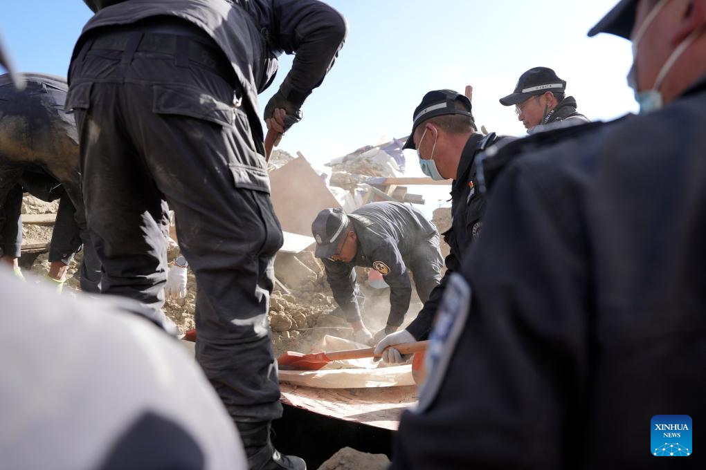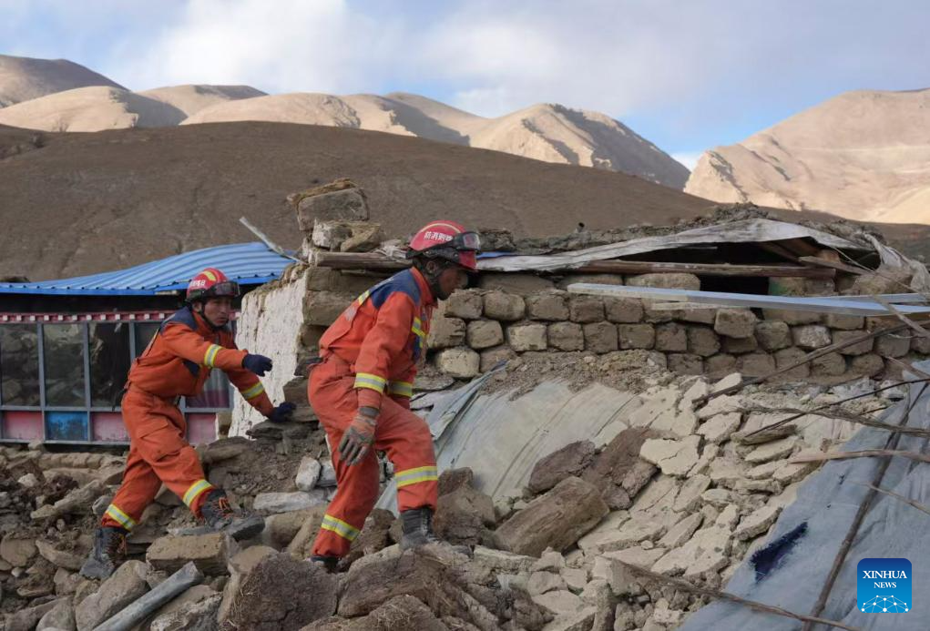 Rescuers work at a village in Changsuo Township of Dingri County in Xigaze, southwest China's Xizang Autonomous Region, Jan. 7, 2025. A total of 126 people have been confirmed dead and 188 others injured as of 7 p.m. Tuesday, after a 6.8-magnitude earthquake jolted Dingri County on Tuesday morning. (Xinhua/Jigme Dorje)