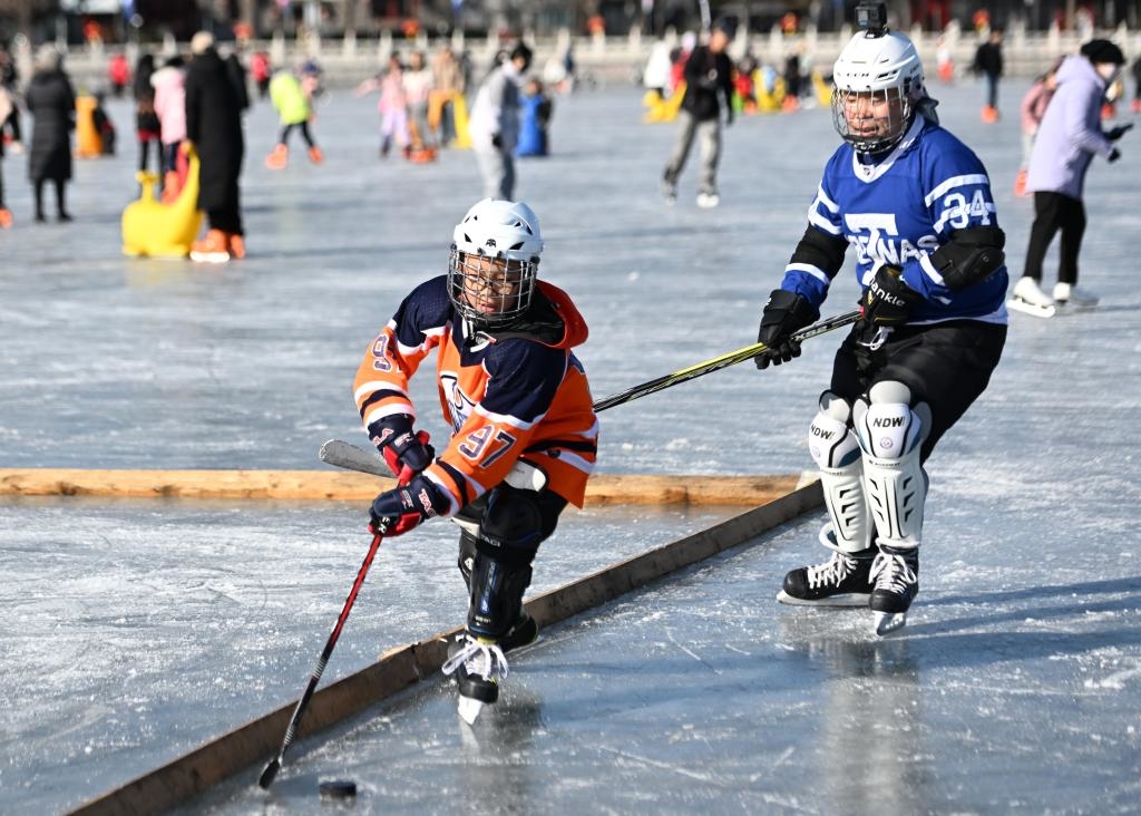 A child practices ice hockey on the frozen Shichahai Lake in Beijing, Jan 19, 2025. [Photo/Xinhua]
