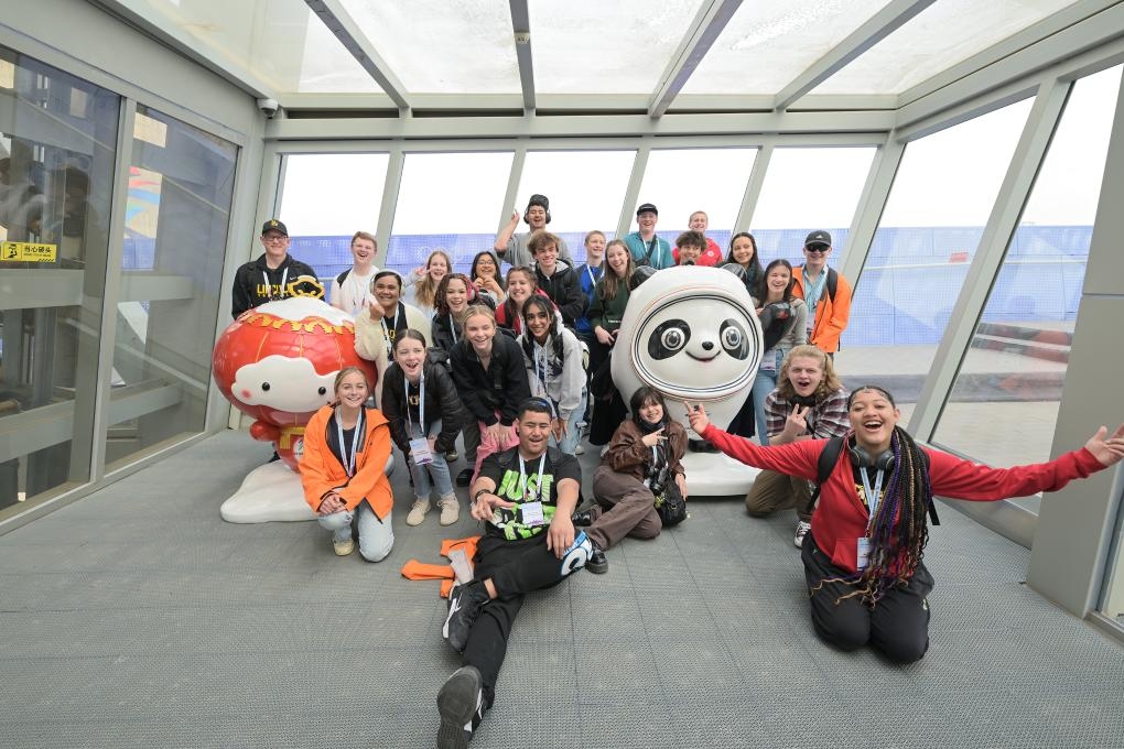 Members of a delegation of high school students from the US state of Washington pose for a photo with Bing Dwen Dwen, mascot of the Beijing 2022 Olympic Winter Games, and Shuey Rhon Rhon, mascot of the Beijing 2022 Paralympic Winter Games, at Big Air Shougang in Beijing, March 21, 2024. [Photo/Xinhua]