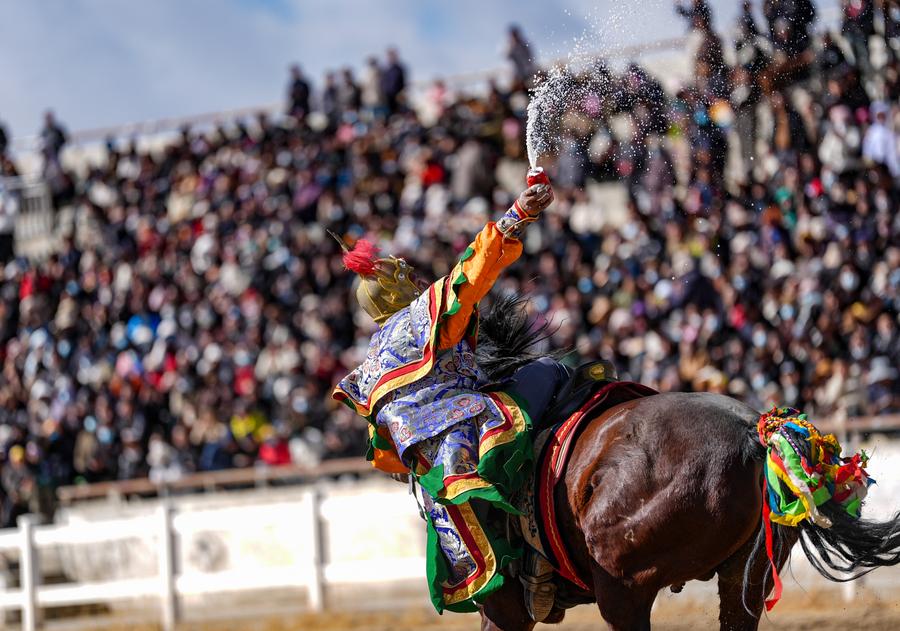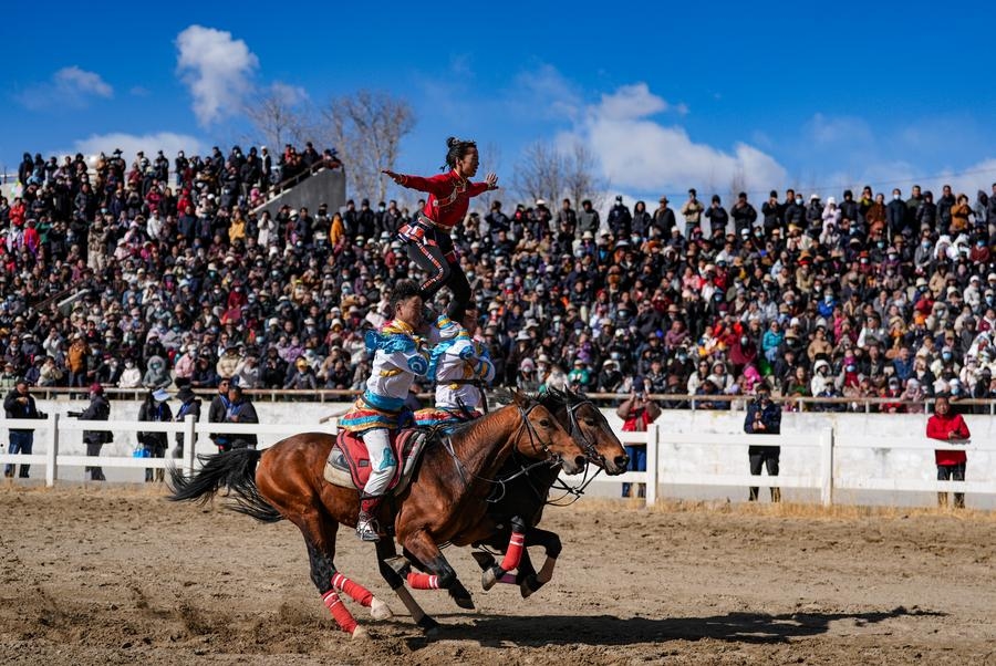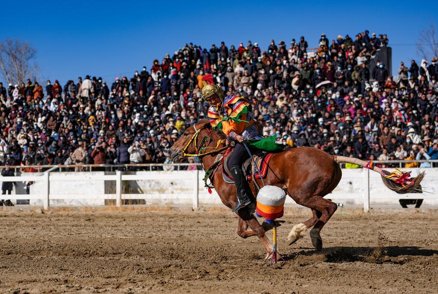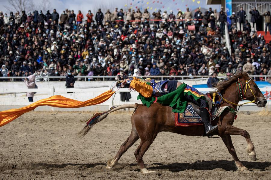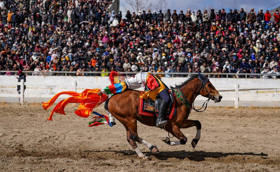 LHASA, March 2 (Xinhua) -- The city of Lhasa hosted an equestrian show on the third day of the Tibetan New Year, featuring traditional equestrian performances and horse races. The riders were dressed in colorful Tibetan clothes and galloped gracefully around the racecourse in the northern suburbs of the city.