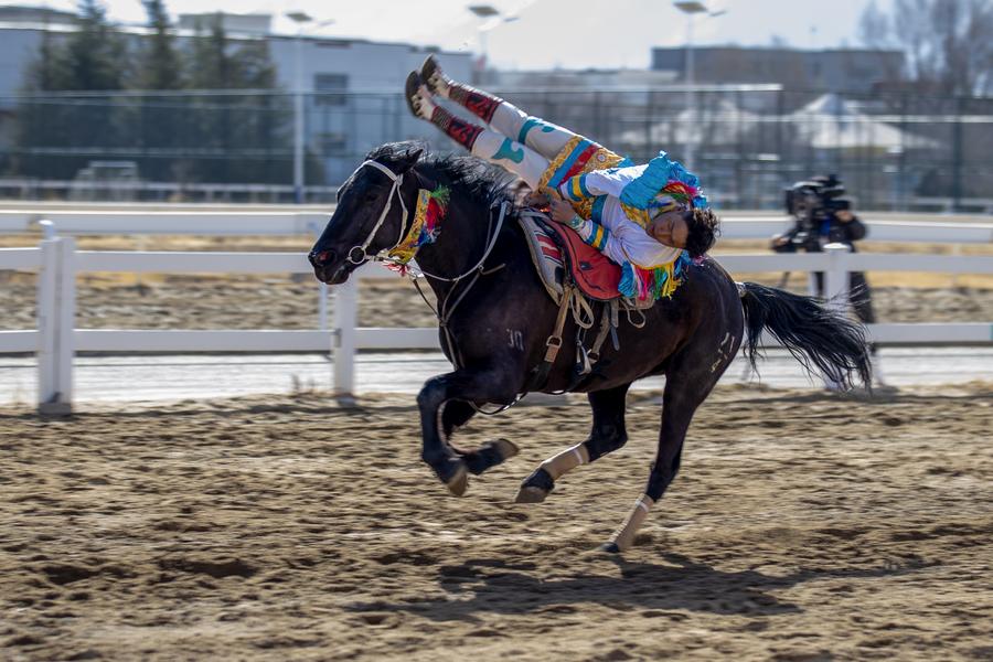 A rider performs in Lhasa, southwest China's Xizang Autonomous Region, March 2, 2025. (Xinhua/Jiang Fan)