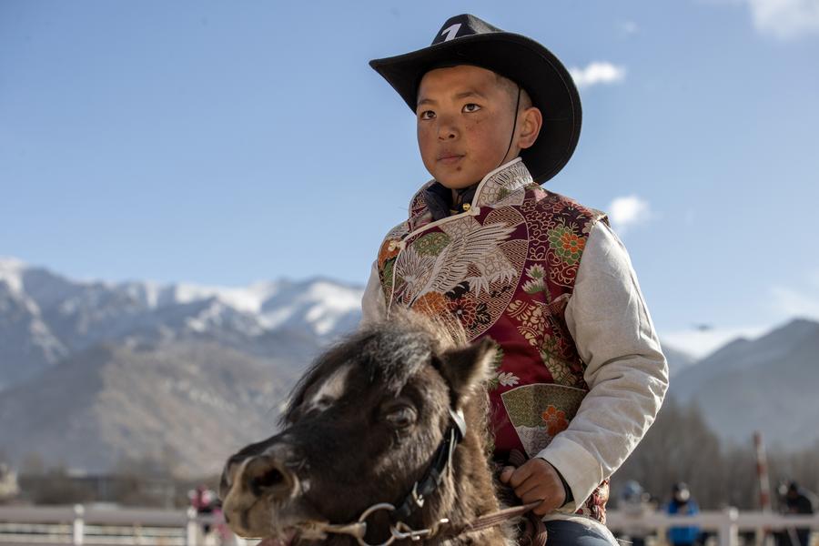 A young rider enters the racecourse in Lhasa, southwest China's Xizang Autonomous Region, March 2, 2025. (Xinhua/Jiang Fan)