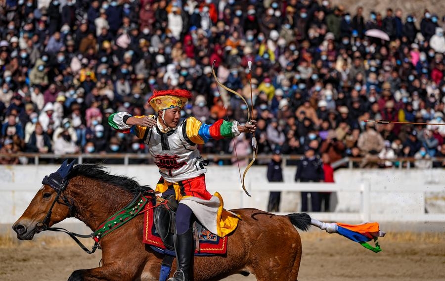 A rider performs riding and archery in Lhasa, southwest China's Xizang Autonomous Region, March 2, 2025. (Xinhua/Jigme Dorje)