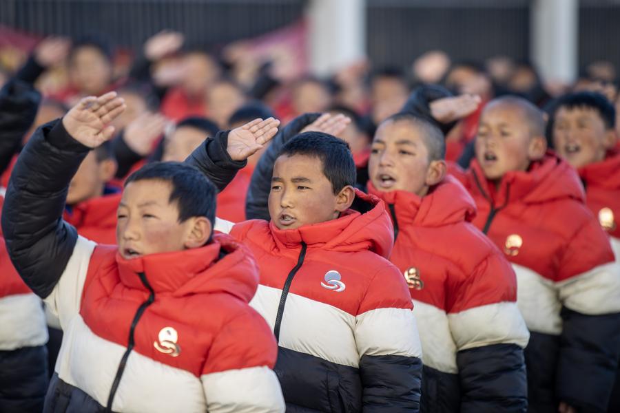 Students from three severely-shattered townships chorus during a ceremony marking the new semester at a temporary site in Dingri County, southwest China's Xizang Autonomous Region, March 5, 2025. (Xinhua/Jiang Fan)