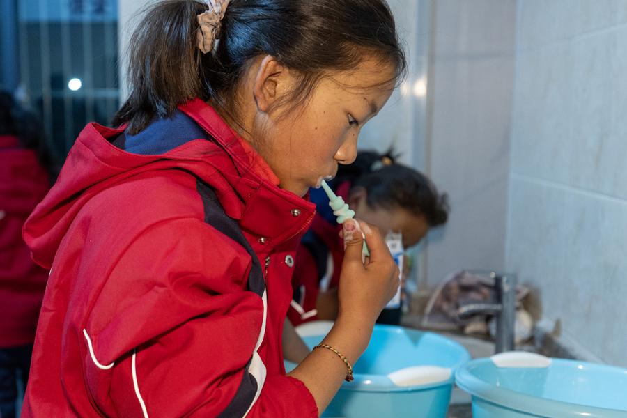 Students from three severely-shattered townships brush their teeth at a temporary site in Dingri County, southwest China's Xizang Autonomous Region, March 5, 2025. (Xinhua/Jiang Fan)