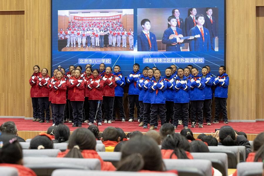 Students from three severely-shattered townships chorus with students from Beijing, capital of China, and Chengdu, capital of southwest China's Sichuan Province, via video link during a ceremony marking the new semester at a temporary site in Dingri County, southwest China's Xizang Autonomous Region, March 5, 2025. (Xinhua/Jiang Fan)