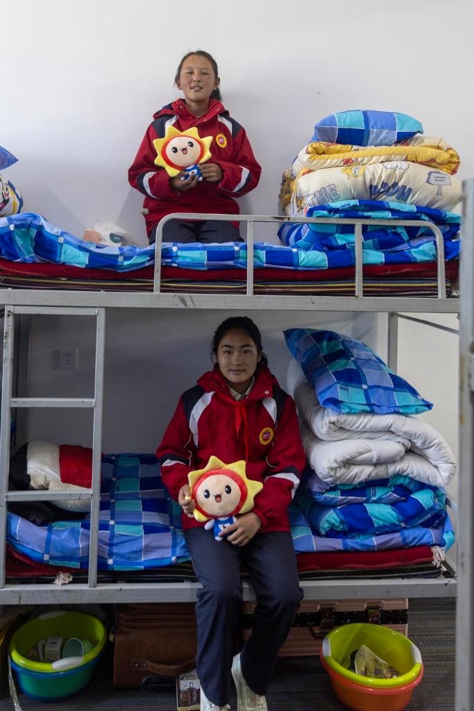 Students display stuffed toys prepared by their teachers in dormitory at a temporary site in Dingri County, southwest China's Xizang Autonomous Region, March 4, 2025. (Xinhua/Jiang Fan)