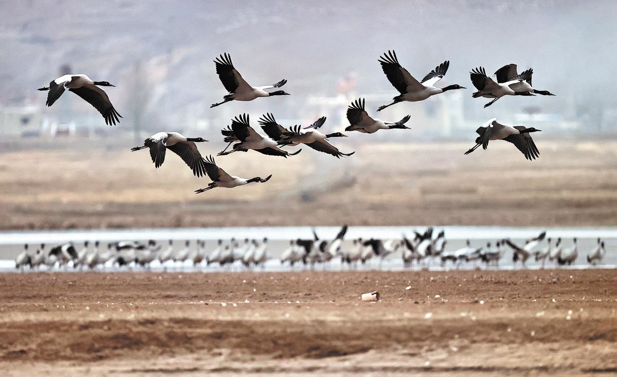 Black-necked cranes winter at a reservoir in Lhundrub county, Lhasa, Xizang autonomous region, on Saturday. When it gets warmer, they will fly to areas including the Siling Lake National Nature Reserve to breed. TENZIN NYIDA/XINHUA