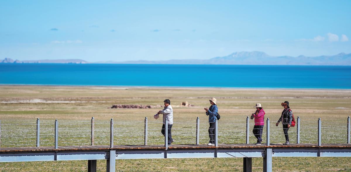 Tourists walk a raised path by the Siling Co (Lake) in the Xizang autonomous region in June. The lake and its surrounding natural reserve serve as an important habitat for black-necked cranes. TENZIN NYIDA/XINHUA
