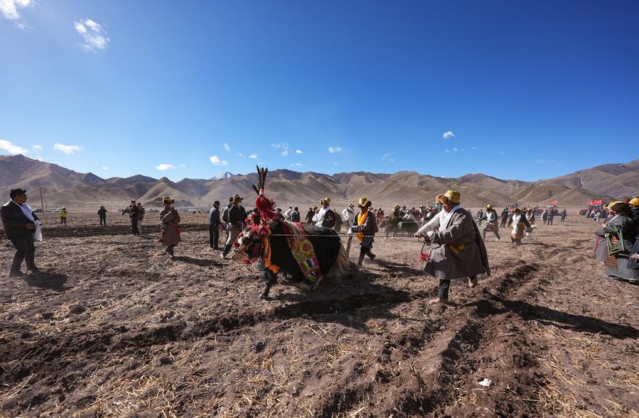 LHASA, March 16 (Xinhua) -- Ceremonies marking the start of spring farming were held across southwest China's Xizang Autonomous Region on Sunday. The ceremony holds great significance as it marks the beginning of a new year's farming season and serves as a prayer for favorable weather and bountiful harvests. It is considered an important ritual in the farming regions of Xizang.