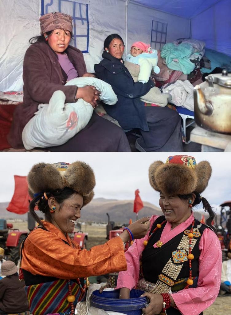 This combo photo shows Tenzin Droma (R) and her fellow villager staying at a temporary shelter after a 6.8-magnitude earthquake struck southwest China's Xizang in January, taken on Jan. 7, 2025 (above); and they participate in a ceremony marking the start of spring farming in Quxar Town of Lnaze County, southwest China's Xizang Autonomous Region on March 16, 2025 (below). (Xinhua/Jiang Fan)