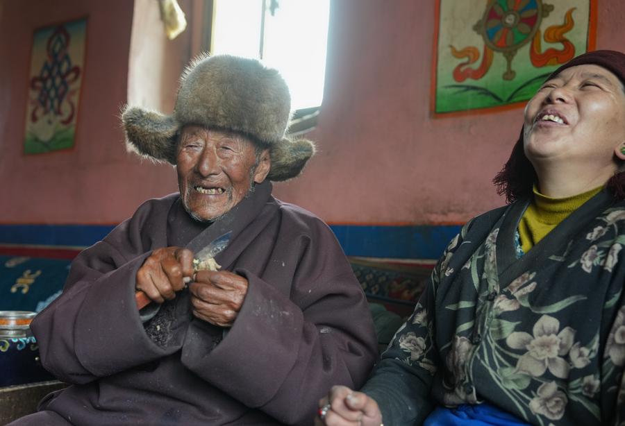 Sonam Tashi (L) enjoys food with a family member in Chubzang village of Doilungdeqen District in Lhasa, southwest China's Xizang Autonomous Region, March 20, 2025. (Xinhua/Jigme Dorje)